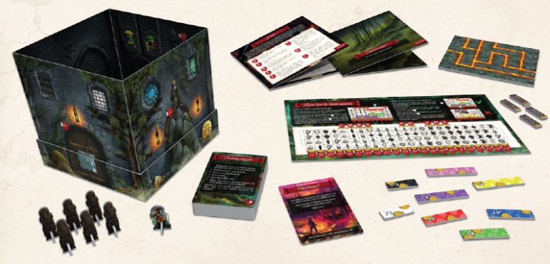 Contenu: 47 cartes, 1 grille de réponse, 8 jetons Réponse, 1 fiche d’Indices, 1 pion Héros, 4 jetons Puzzle du coffre, 6 pions Totem, 3 éléments de décor 3D, 1 plateau recto verso.
