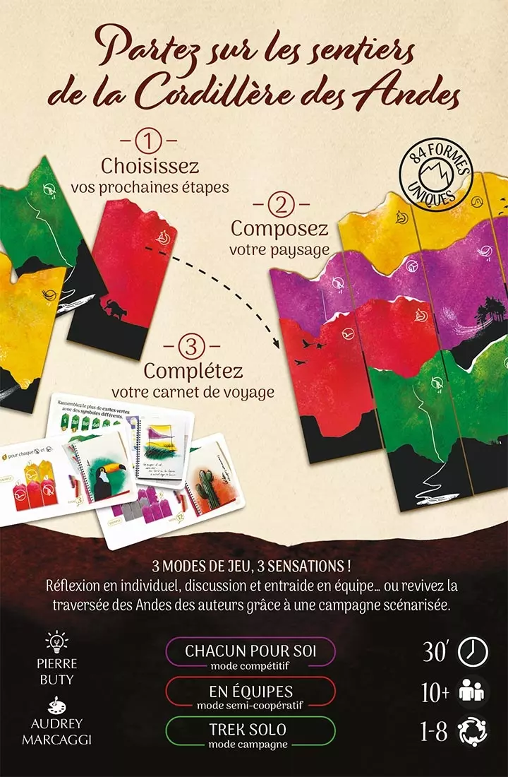 Plongez dans l’univers envoûtant de Sierra, un jeu qui vous emmène dans une aventure fascinante à travers les sentiers enchanteurs de la Cordillère des Andes. Sierra allie de manière ingénieuse exploration, création de tableaux et compétition pour les points, tout en mettant en avant la coopération en équipe où le compromis et la bienveillance sont essentiels.