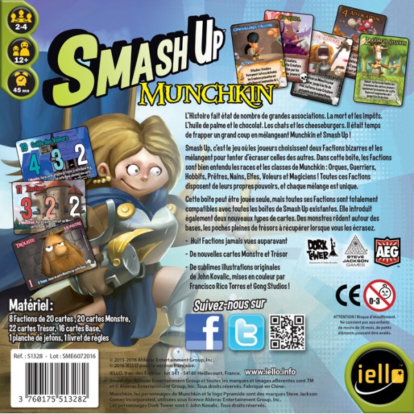 L’Histoire fait état de nombre de grandes associations. La mort et les impôts. L’huile de palme et le chocolat. Les chats et les cheeseburgers. Il était temps de frapper un grand coup en mélangeant Munchkin et Smash Up ! Smash Up, c’est le jeu où les joueurs choisissent deux Factions bizarres et les mélangent pour tenter d’écraser celles des autres.