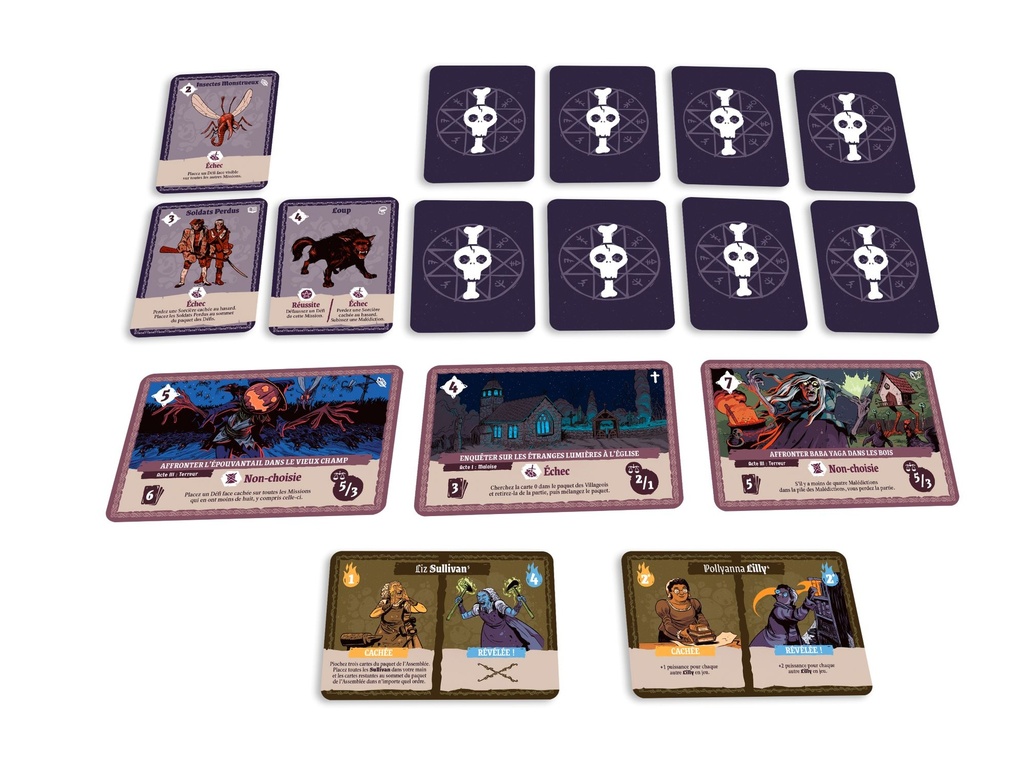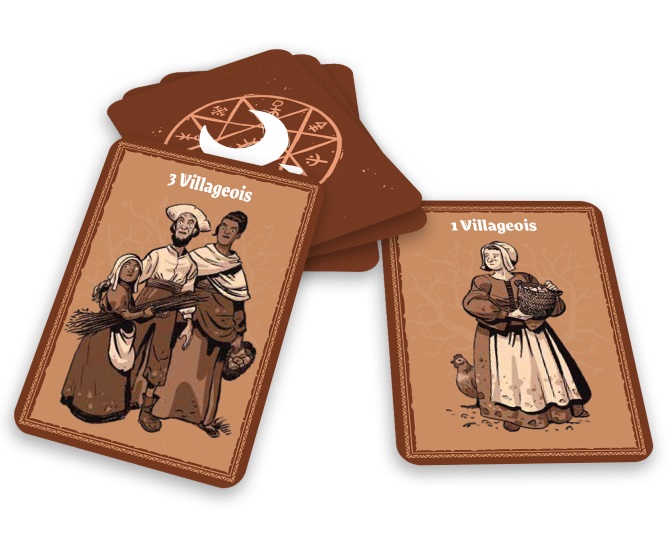 Contenu: 28 cartes Sorcière, 8 cartes Juré, 12 cartes Conviction, 6 cartes Malédiction, 60 cartes Défi (40 liées à un Juré + 20 communes), 8 cartes Villageois, 3 marqueurs de Persuasion, 24 cartes Mission, 8 cartes Villageois, 1 livret de règles, 1 aide de jeu.