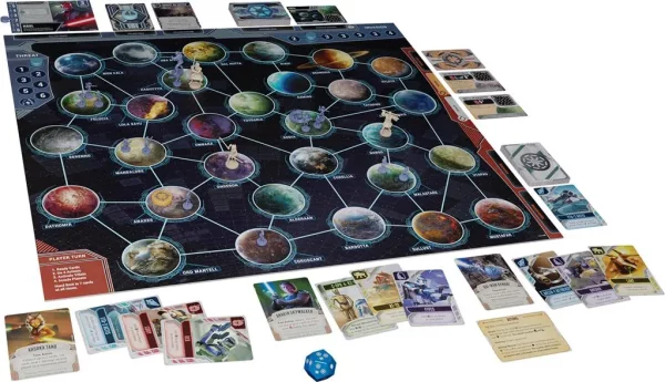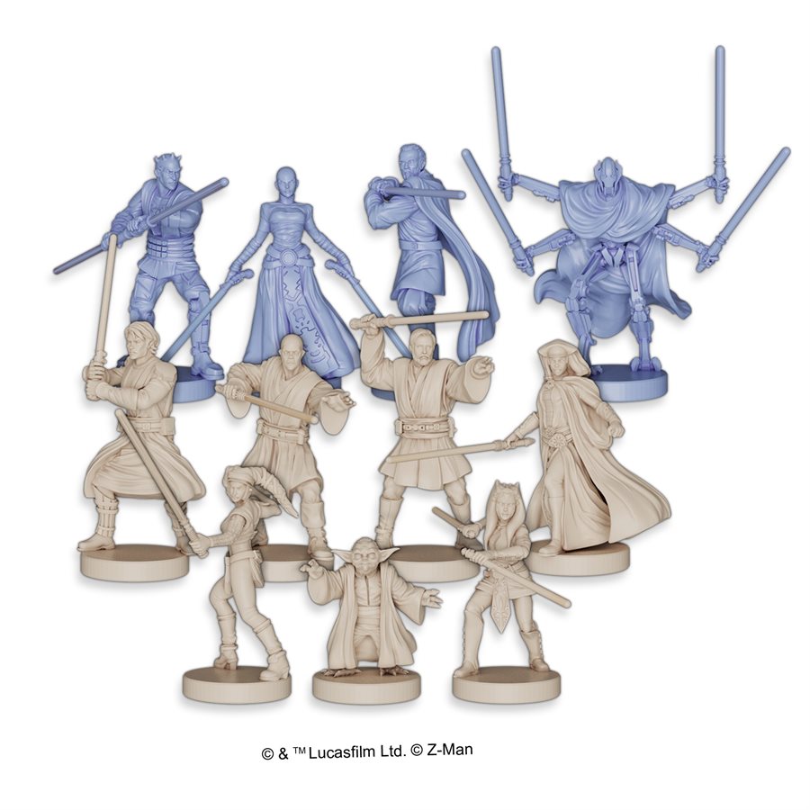 Une présence épique sur une table avec un plateau de grande taille, des cartes illustrées et des figurines saisissantes, dont des Jedi légendaires, des méchants emblématiques et des essaims de droïdes de combat et de navires de blocus.