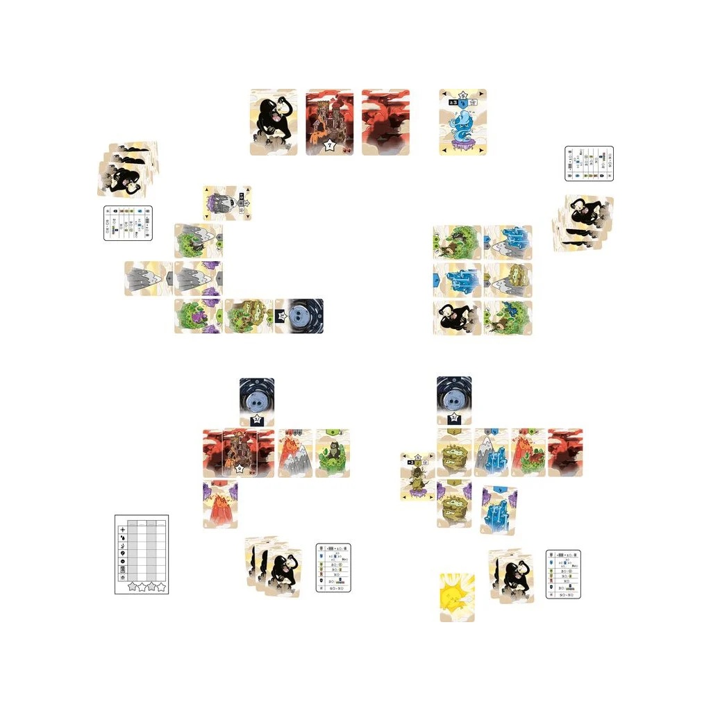 Contenu: 93 cartes dont : 1 carte Soleil, 4 cartes Terre de départ, 60 cartes Terre, 5 cartes Ville Sombre, 11 cartes Fumerole, 8 cartes Voyageur, 4 cartes Aide de jeu, 1 carnet de score, 1 livret de règles.