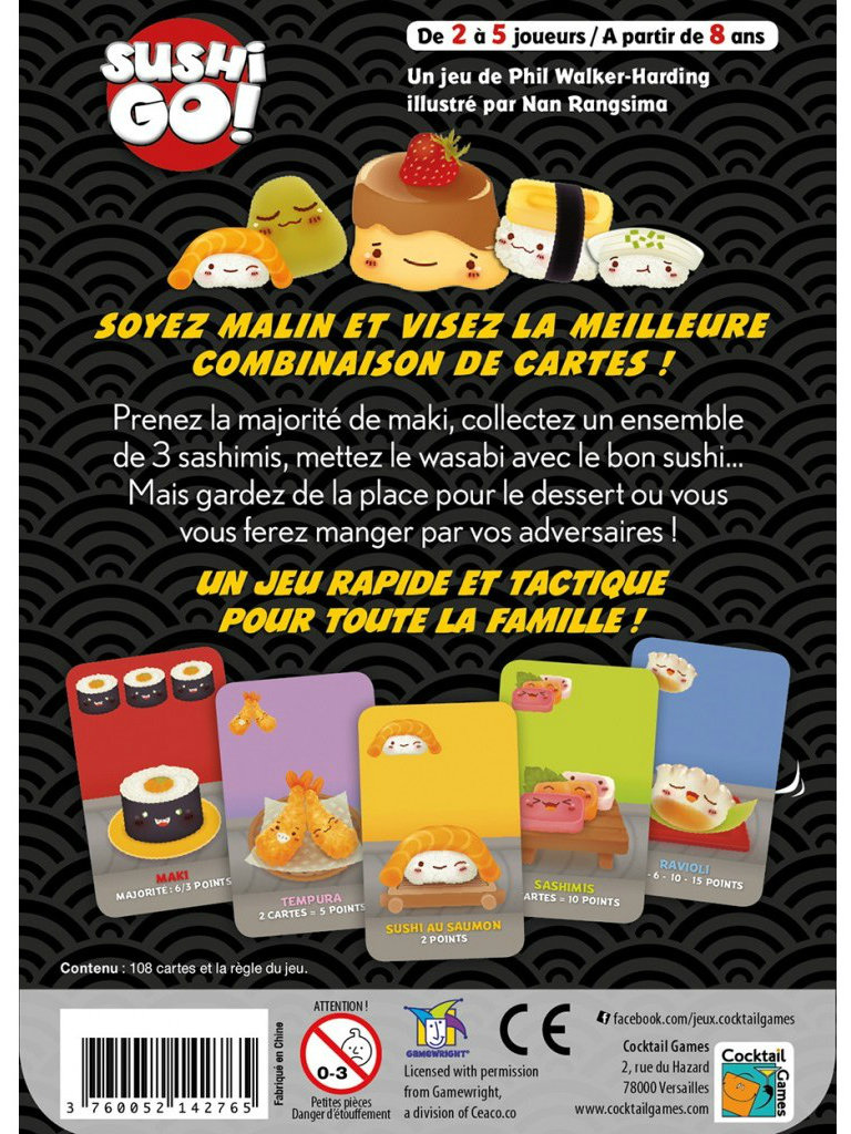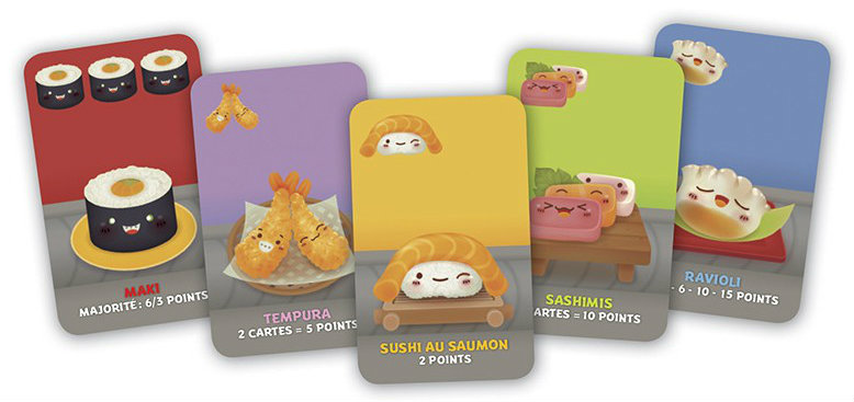 Dans ce jeu de carte rapide, l’objectif est d’attraper la meilleur combinaison de plats de sushis qui vous passent entre les mains. Vous marquez des points pour faire le plus de Maki ou pour avoir la collection complète de sashimi. Trempez vos nigiris favoris dans le wasabi pour tripler leur valeur, mais soyez certain de vous réserver de la place pour le dessert ou sinon vous mangerez vos points!