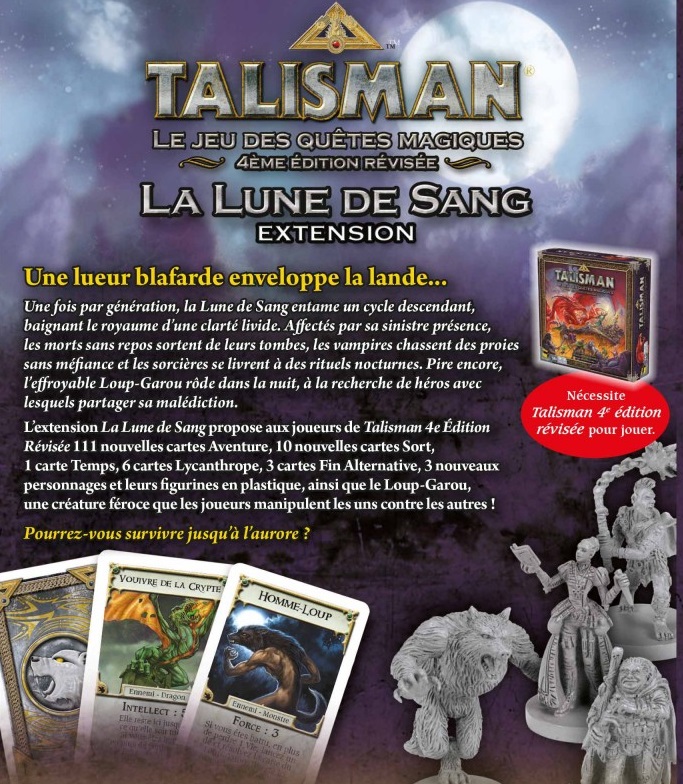 L’extension La Lune de Sang propose aux joueurs de Talisman 4ème Édition Révisée, 111 nouvelles cartes Aventure, 10 nouvelles cartes Sort, 1 carte Temps, 6 cartes Lycanthrope, 3 cartes Fin Alternative, 3 nouveaux personnages et leurs figurines en plastique, ainsi que le Loup-Garou, une créature féroce que les joueurs utilisent les uns contre les autres.