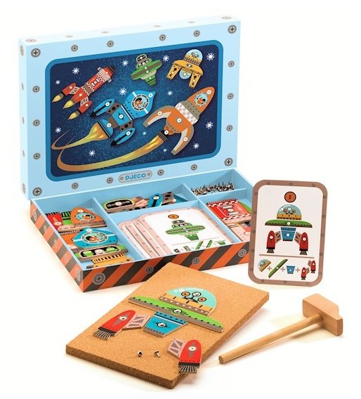 Contient: 1 planche de liège, 5 cartes d’exemples à construire (2 par carte), multitude de formes en bois laquées et trouées, 1 marteau + clous adaptés aux petites mains.