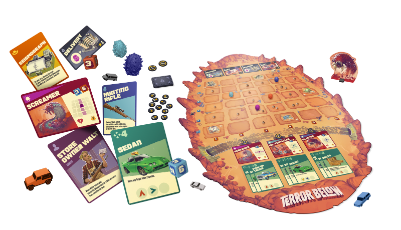 Dans Terror Below, votre objectif est d’être le premier à marquer 20 Points de victoire. En fonction du Véhicule que jouez face à un Ver, vous aurez un certain nombre d’Actions à exécuter : détourner son attention, se déplacer sur le plateau de jeu, ramasser des décombres pour les échanger contre des Armes ou des Objets de survie, ramasser un Oeuf de Ver pour le livrer, puis combattre. Si votre personnage meurt, recrutez-en un autre, mais attention car vous n’en aurez que 3 au départ !