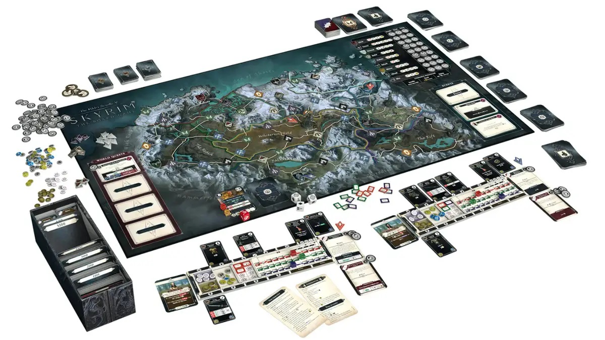 Le plateau de jeu représente la province de Skyrim. Les joueurs déplacent leurs personnages – représentés par des figurines en plastique à l’échelle 32 mm – à travers la région, visitant des forteresses, explorant des donjons et rencontrant des personnages intéressants au fil de l’histoire. Mais ils ne sont pas les seuls sur place ; des monstres errants apparaissent, bloquant les routes et menaçant la paix dans Skyrim. Plusieurs effets du jeu peuvent entraîner la chute d’une forteresse. Les joueurs doivent donc garder un œil sur l’état d’agitation et les dangers actifs dans tout le pays.
