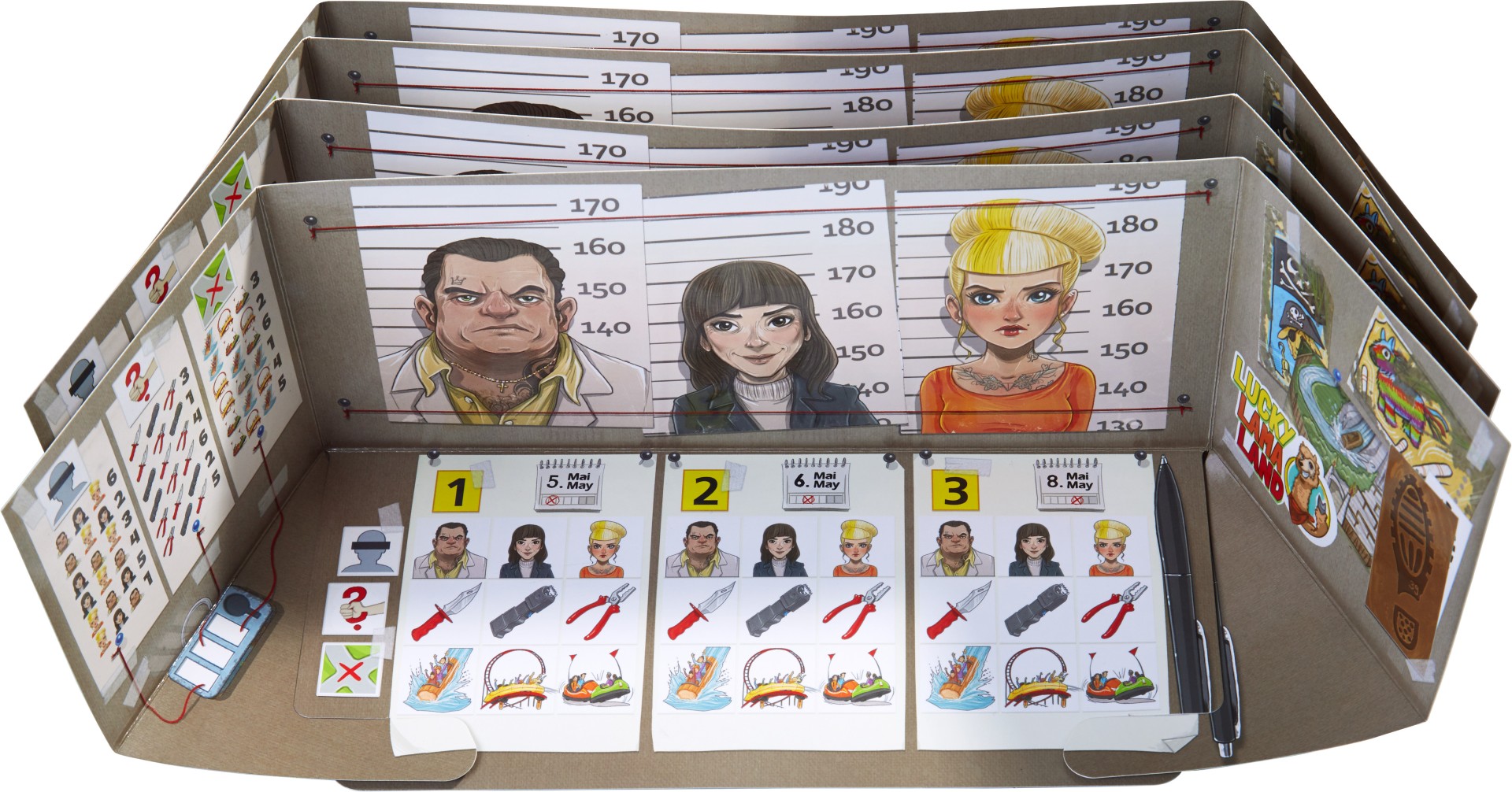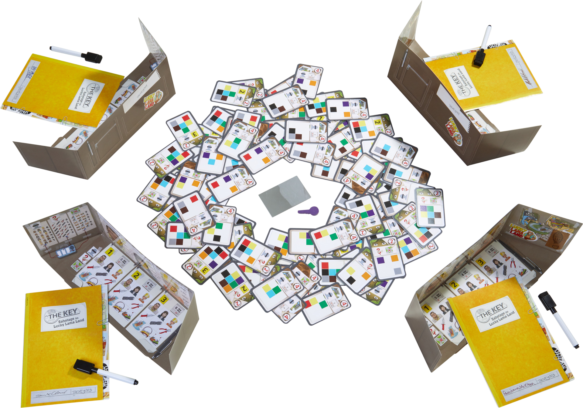 Contenu: 4 porte-documents paravents, 4 feutres avec une petite éponge, 4 dossiers d’enquête, 9 clés en bois, 1 carton de solutions, 140 cartes : 86 cartes « témoignage », 54 cartes « laboratoire » (18 cartes « trace de pas », 18 cartes « billet d’attraction », 18 cartes « photographie »), 1 carte-miroir.