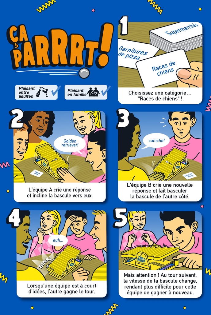 Pigez une carte Catégorie, criez une réponse et inclinez la bascule de votre côté. C’est à l’autre équipe de répondre, et ainsi de suite. Lorsqu’une équipe est à court d’idées, l’autre gagne le tour. Au tour suivant, la vitesse de la bascule change, rendant plus difficile pour cette équipe de gagner à nouveau. Au bout de 5 tours gagnés, c’est la victoire!