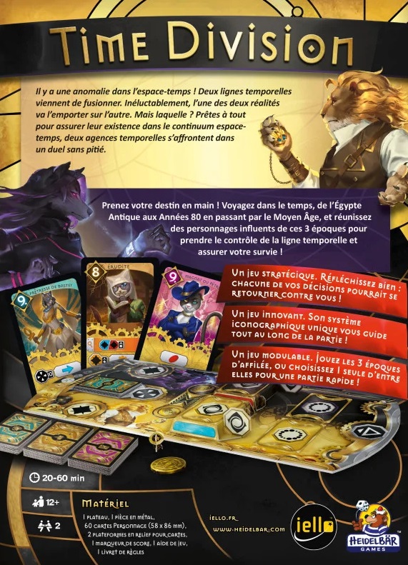 Time Division est un jeu destiné au 1 contre 1, avec une durée de jeu variable de 20 minutes pour une simple partie et jusqu’à 60 minutes si vous optez pour le mode campagne. Chaque joueur prend le contrôle de l’une des deux agences : « Le Sablier Doré », qui s’efforce de préserver l’ordre, et « L’aiguille Noire », qui opère dans l’ombre. Ces deux factions se battent pour influencer des personnages historiques dans diverses époques, telles que l’Égypte Ancienne, le Moyen Âge ou encore les années 80.