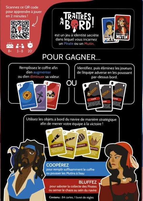 Dans le jeu Traîtres à Bord !, au début de la partie, vous découvrez secrètement si vous êtes un pirate ou un traitre (mutin). Tour à tour, contribuez à remplir le coffre ou mettez des bâtons dans les roues de l’équipage. Les pirates gagnent la partie s’ils parviennent à remplir suffisamment le coffre ou s’ils arrivent à pousser tous les mutins à l’eau. Les mutins gagnent la partie s’ils parviennent à empêcher la collecte de l’équipage ou s’ils arrivent à pousser suffisamment de pirates par-dessus bord.