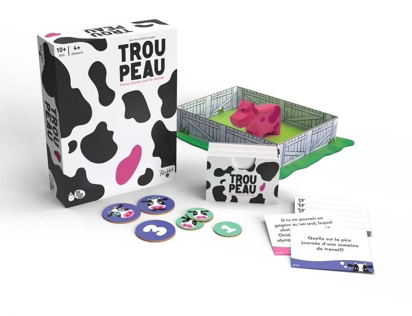 Contenu: 160 cartes Question, 62 jetons Vache, 2 paquets de feuilles Réponse, 1 vache rose, 1 livret de règle.