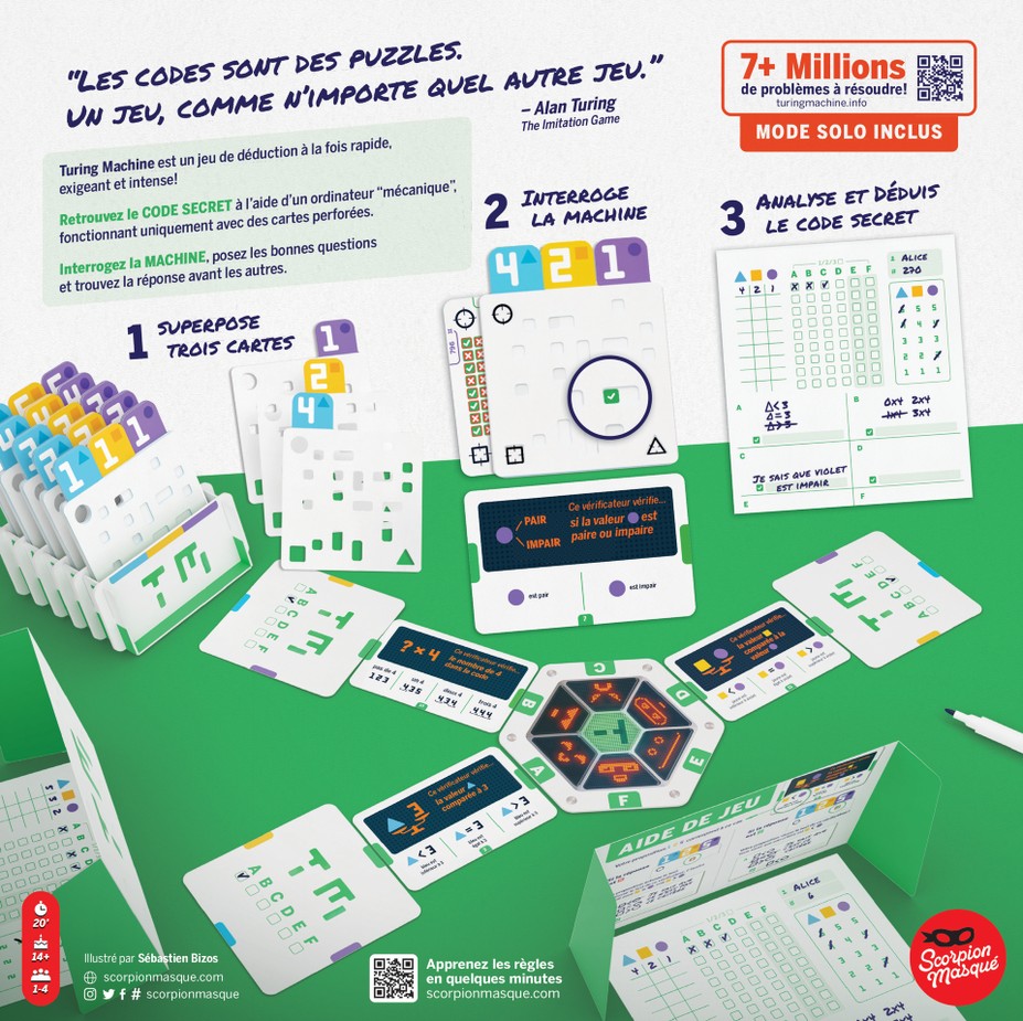 Turing Machine est un jeu de déduction compétitif unique en son genre. Retrouvez le code secret à l’aide d’un ordinateur « mécanique » fonctionnant avec uniquement des cartes perforées. Interrogez la machine, posez les bonnes questions et trouvez la réponse avant les autres.
