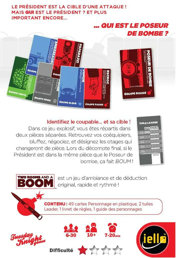 Dans ce jeu explosif, vous êtes répartis dans deux pièces séparées. Retrouvez vos coéquipiers, bluffez, négociez, et désignez les otages qui changeront de pièce. Lors du décompte final, si le Président est dans la même pièce que le Poseur de bombe, ça fait BOUM!