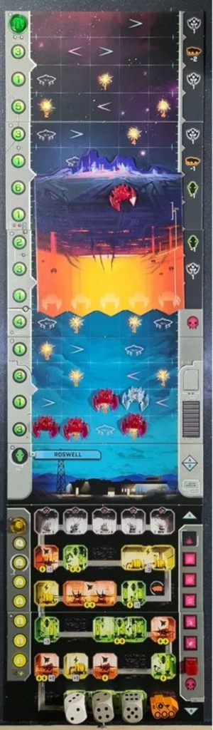 De son côté, le joueur doit optimiser ses lancers de dés en les plaçant à l’intérieur de son bunker souterrain pour développer la riposte. Les dés peuvent être placés sur différentes sections : recherches sur l’envahisseur alien, envoi de chasseurs, déploiement de robots et gain d’énergie. La valeur de chaque dé placé impacte directement vos capacités de production et de défense, et plus vous consacrez de ressources à l’amélioration de votre Bunker, plus votre défense sera efficace. Mais attention : plus vos dés sont forts, plus les chasseurs ennemis vont descendre rapidement !