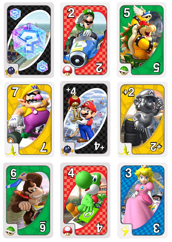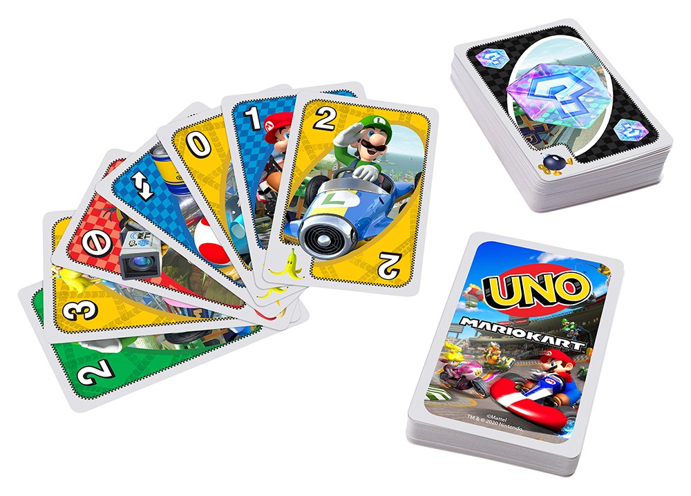 Il se joue comme le jeu UNO classique, sauf que chaque carte est dotée d’une icône d’OBJET dans un coin (Champignon, Pelure de banane, Carapace verte, Foudre ou Bombe). Les OBJETS n’ont aucun effet pendant le jeu normal. Mais lorsque la carte blanche Boîte à objets est jouée, le joueur retourne la carte sur le dessus de la PIOCHE (la pile où l’on pige les cartes) et utilise immédiatement l’OBJET de cette carte! Chaque OBJET offre une action différente. Ce coffret constitue un excellent cadeau pour les joueurs de 7 ans et plus, en particulier les fans de Mario Kart. Les couleurs et les motifs peuvent varier.