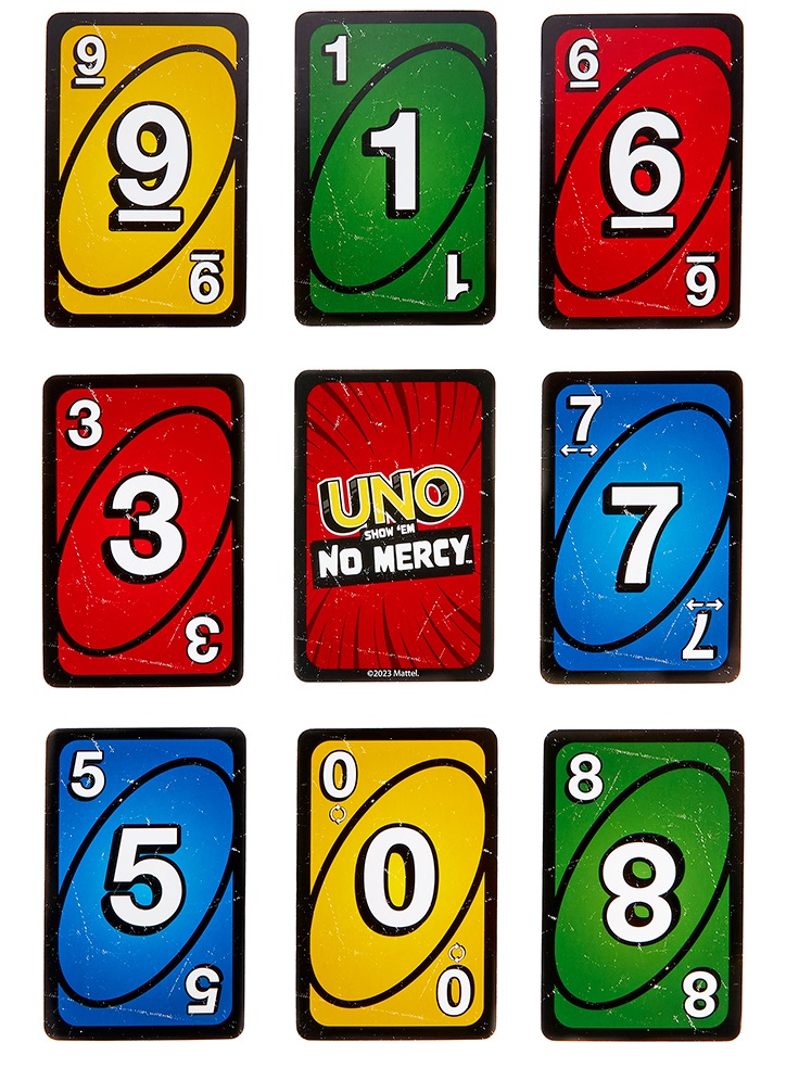Le jeu UNO Show ‘em No Mercy comprend 112 cartes UNO et 56 cartes supplémentaires, des règles spéciales et des cartes Action redoutables pour l’édition la plus brutale de UNO!