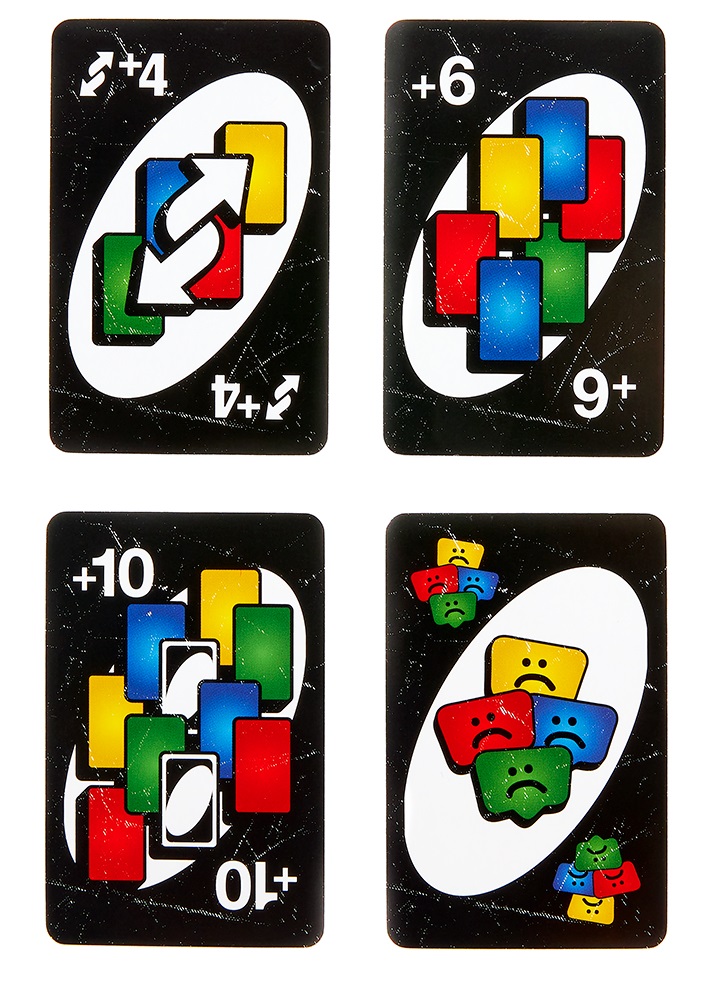 Il comporte beaucoup plus de cartes et des pénalités BEAUCOUP plus sévères (piger 10cartes, quelqu’un?) et de nouvelles règles qui permettront aux joueurs d’empiler, d’échanger et de piger plus de cartes que jamais! Et il y a même une règle Pitié (oui, nous comprenons l’ironie) si les choses deviennent trop difficiles. Il y a 2 façons de gagner dans cette version impitoyable du jeu classique: se débarrasser de toutes ses cartes OU éliminer tous les autres joueurs! Oh Et quand il ne vous reste qu’une seule carte, n’oubliez pas de crier UNO! .