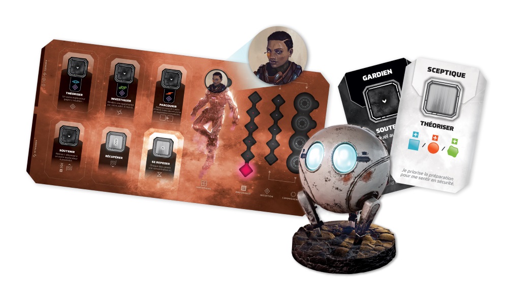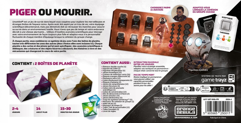 Contenu: Boîte de base : 12 cubes de concentration, 2 marqueurs d’aubaine, 1 figurine de LUNA, 4 figurines d’explorateur, 2 dés de découverte, 24 cubes verts, 24 cubes bleus, 6 disques orange, 12 cubes noirs, 1 marqueur de temps, 1 marqueur de cohésion, 4 cubes de poursuite scientifique, 4 marqueurs d’endurance, 3 tuiles Scarabée (vaisseau) recto verso, 3 tuiles Structure, 12 tuiles Trait de personnalité, 15 jetons Avatar, 4 jetons de compréhension de la robotique, 4 jetons de compréhension de l’ingénierie, 4 jetons de compréhension de la chimie, 4 aides de jeu, 1 livret de règles. Boîte de planète : 12 jetons Investigué, 6 jetons Déclencheur, 4 plateaux principaux et leurs GameTrayz, 4 tableaux de bord à double couche, 48 grandes cartes : environnements, tâches de survie, opportunités, cartes spécifiques à la planète (le nombre de ces cartes varie en fonction de la boîte), 12 cartes Avancée, 12 cartes Détresse, 12 cartes Anomalie, 12 jetons Découverte, Jetons spécifiques à la planète.