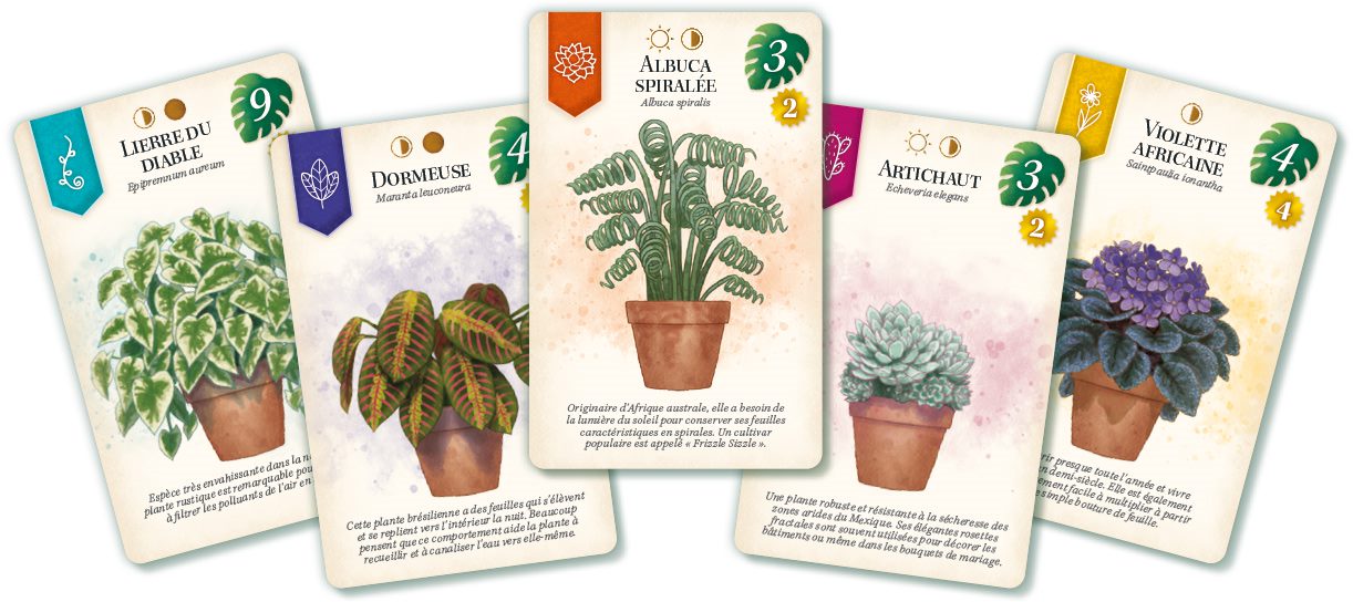 À chaque tour, vous sélectionnez une paire adjacente d’une carte et d’un jeton, puis vous utilisez ces éléments pour construire un tableau de cartes toujours plus grand qui représente votre maison. Vous devez garder à l’esprit divers objectifs pour tenter d’accroître la verdure des plantes en établissant des correspondances spatiales et en utilisant des jetons d’objets pour effectuer diverses actions de soin. Vous pouvez également développer vos compétences en matière de «main verte», ce qui vous permet d’entreprendre des actions supplémentaires pour prendre soin de vos plantes et créer l’espace le plus douillet qui soit !