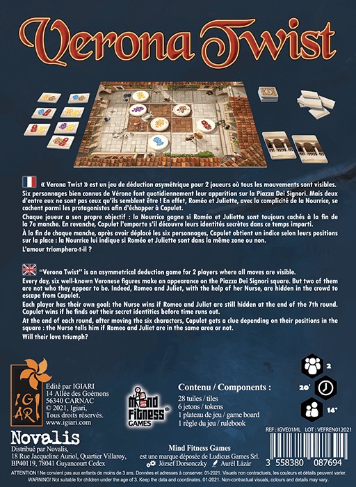 « Verona Twist » est un jeu de déduction asymétrique pour 2 joueurs où tous les mouvements sont visibles.