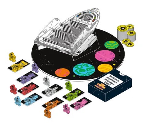 Contenu: 1 vaisseau spatial, 8 astro-meeples, 110 cartes, 1 distributeur de cartes, 8 jetons personnages, 53 pièces Étoile, 1 plateau de jeu, la règle du jeu.