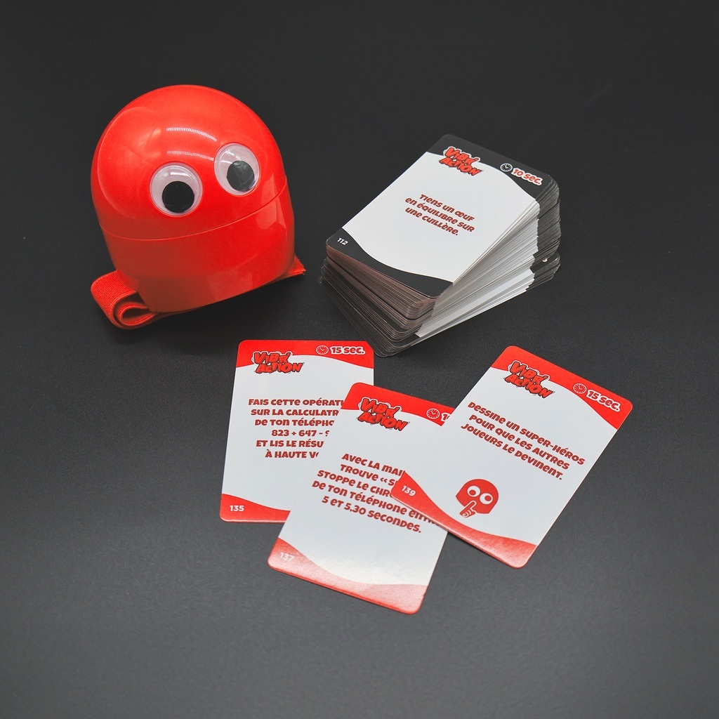 200 challenges pour vous faire trembler…Mettez le bracelet VIBR’ACTION à votre main. Votre mission : réaliser le challenge décrit sur une carte dès que le bracelet est mis en route !