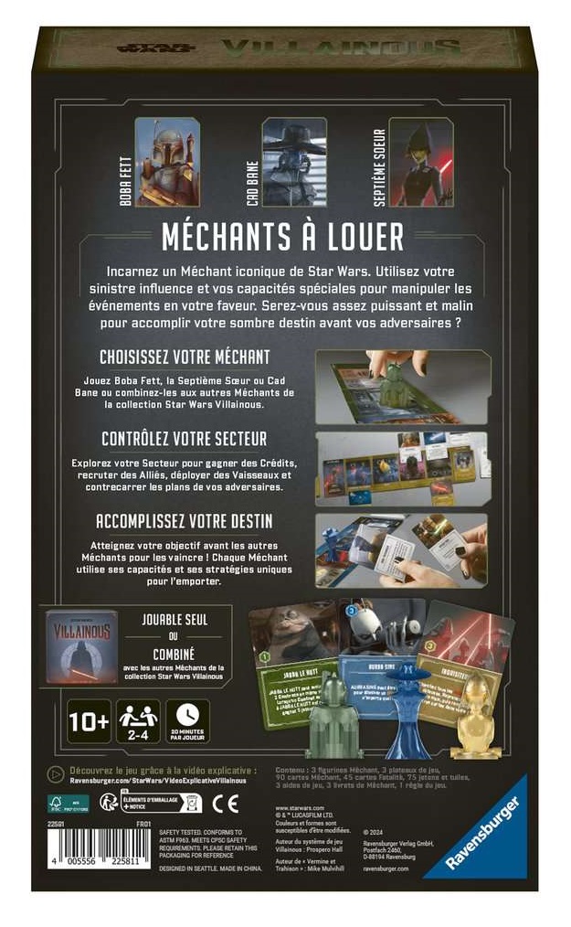Jouable seul ou combinable avec n’importe quel autre jeu de la collection Star Wars Villainous. Jeu jouable dès 10 ans pour 2 à 3 joueurs pour de parties de 20 minutes par joueur.