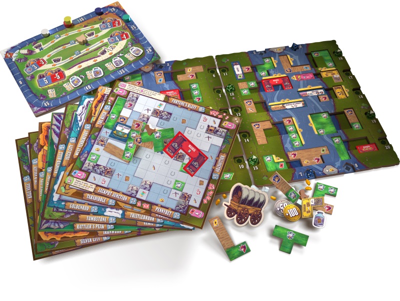 Contenu: 8 plateaux Colonie recto verso, 5 pistes de mine, 4 plateaux Tuiles, 96 tuiles, 1 plateau Score, 16 cartes Partenaire, 6 dés pour drafter les tuiles, 30 pépites d’or, 35 balles/tombes, 15 santiags, 15 bandits des collines, 25 allées, 4 contrats de bétail, 4 cartes As, 12 cartes pour le mode Solo.