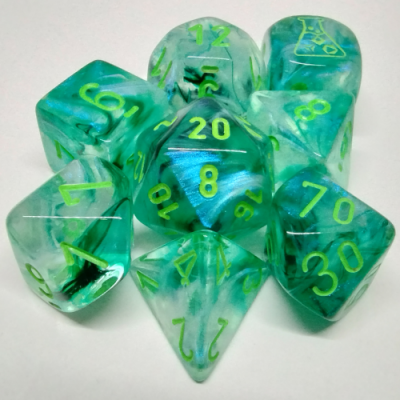Lab Dice 7 pcs – Translucides: Vert Fluo à chiffres Blancs avec Dés Bonus