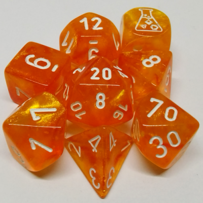 Lab Dice 7 pcs – Translucides: Orange Fluo à chiffres Blancs avec Dés Bonus
